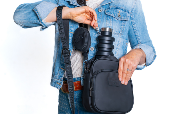 Say goodbye to overstuffed pockets and juggling phones, treats, hydration and waste bags. The FX XBody Bag is designed for French Bulldog owners who want it all - organisation, comfort and style. Crafted in rich midnight black vegan leather with premium gunmetal grey hardware, it's the sleek essential that keeps you hands free and walk ready.